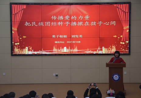 全国民族团结进步示范集体--呼和浩特市昭君博物院昭君文化研究室主任何丽娟以《讲好昭君博物院民族团结进步教育故事--推动新时代党的民族工作高质量发展》为题进行宣讲,讲述昭君出塞故事、昭君文化在内蒙古的传承和发扬等精彩内容。全国人大代表、荣获全国五一劳动奖章、全国脱贫攻坚先进个人等荣誉称号的宜昌市“英子姐姐”刘发英以《传递爱的力量 把民族团结种子播撒在孩子心间》为题,讲述了她长期从事民族地区教育事业、传承民族团结基因、传递民族团结力量,资助民族地区贫困学生,让他们和他们的家庭感受到人间大爱,体会到生活在中华民族大家庭里的温暖故事。