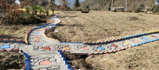 “修路的经费主要来自于乡里财政补贴150元每平方米,不够的部分由该处10户村民自己补72元每平方米,修路时要占到个别村民的小部分茶田和菜地,当时我心里忐忑不安,没想到和村民们一沟通,大家很爽快的支持配合,让出修路的地方,我为白溢坪村有这么一群淳朴善良、甘于奉献的老百姓而感到骄傲。”采花乡白溢坪村支部书记文浩介绍到。村民自己就是工人,男女老少一起出力,每家每户每天轮流做饭,解决大家吃饭问题,在大家齐心协力之下,经过三个多月的奋斗,445米的“五指同心路”水泥路修建成了,今年春上正式投入了使用。为了打通菜地、田地与“五指同心路”的通道,大家又想方设法修建了480米的特色步道,步道两边的砖上涂上了花纹,水泥路两边村民自己栽种了多色玫瑰、迷迭香、格桑花、草莓等植物,花开时姹紫嫣红色彩缤纷,阵阵飘香,成为白溢坪村一道靓丽的风景。